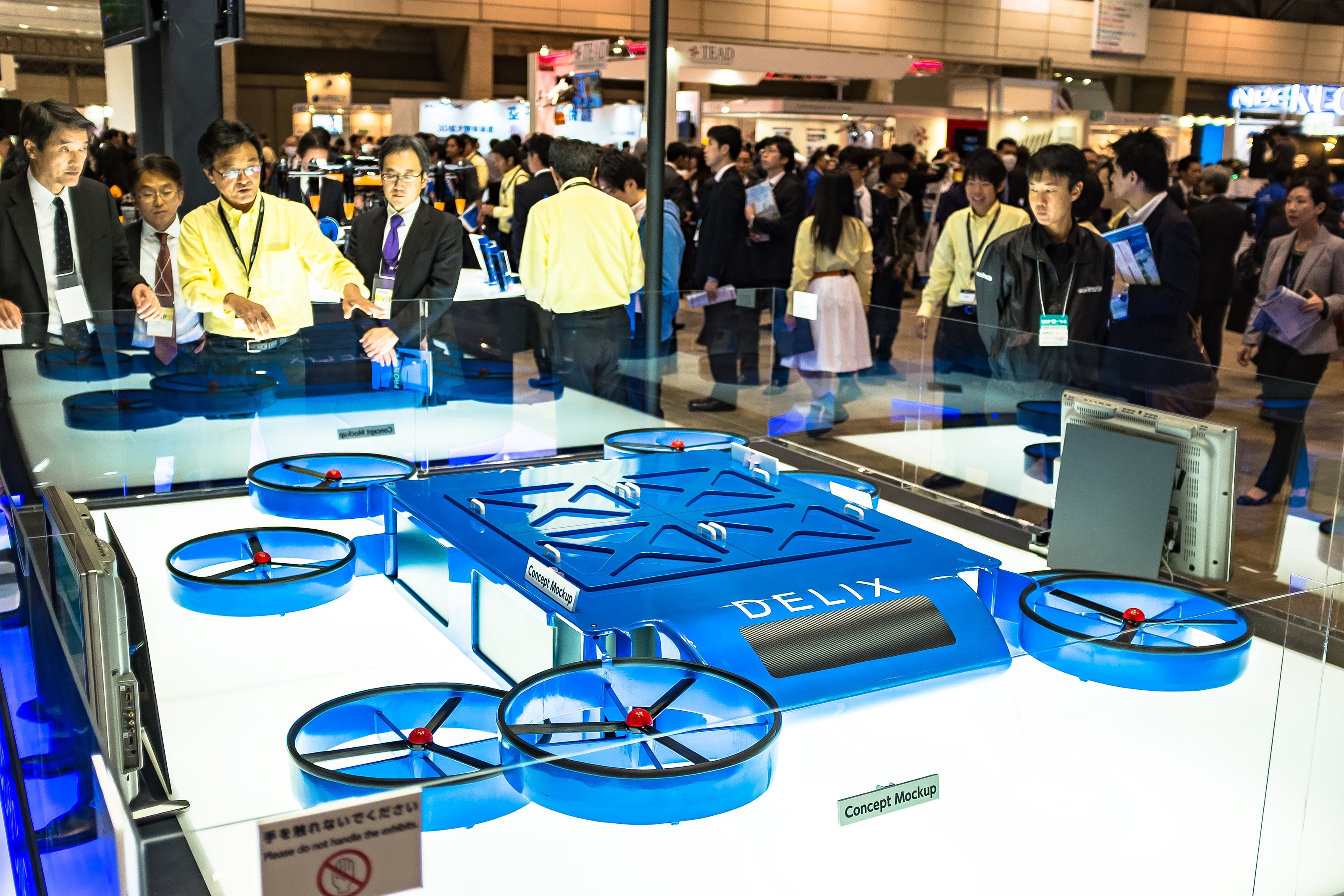 こちらもPRODRONEさんの展示ですが、いよいよデリバリー目的の機体がコンセプトとして形になってきているという事でしょうか。米Amazonがネットショッピングにドローン配送を検討しているという話は随分有名ですが、日本でも千葉県では既に実用化に向けて動き出していると聞きますから、それらに安全と荷台の実用性を加味するとこういうスタイルになるのでしょうね。個人宅への配送は現実的ではないにせよ、倉庫にあるパーツを本社まで運ぶ!なんて業務目的なら確かにマッチしそうな気がしてきます。