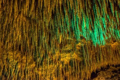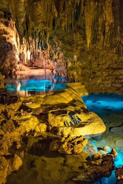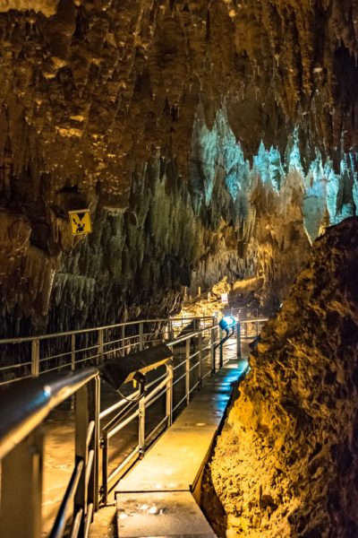 洞窟内所々がブルーやグリーンの光でライトアップされており美しいです。途中小さな滝があったり足元には深い川が流れていたりで大自然の凄みを感じることが出来ます。ちなみにこの鍾乳石、3年で1mmしか伸びないそうです。歴史は長いということですね。