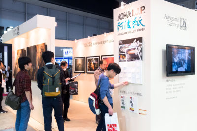 昨年くらいから私もそろそろ写真をプリントして楽しもうなんて考えが出てきて、色々調べている関係でCP+会場でもプリント用紙なども色々吟味してみました。今年は和紙を使ったペーパーが結構注目されていましたね。厚手のペーパーに対応したプリンターであればなんとなく印刷できることは想像できますが、テクニックが必要なのはエッジの処理で、和紙特有のラフなエッジにフチ無プリントを行うためには、薄手の台紙に和紙を貼り付けプリント後、台紙のみ剥がすのだとか...なるほどという感じですね。
