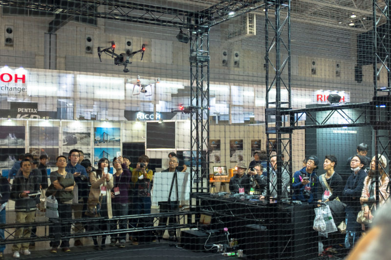 今回デモ飛行を行っていたのはInspire 2、Phantom4 Pro、MAVIC Proの3機。勿論1機ずつの飛行も行っていましたが、写真に撮ってきたように3機が1メートル程の間隔で編隊飛行をしていたのには驚きましたね。それだけ正確に安定してホバリングしなければぶつかってしまうところこの状態で手放しですから。操る事の楽しさは薄れていきますが道具としては完成形ですね。