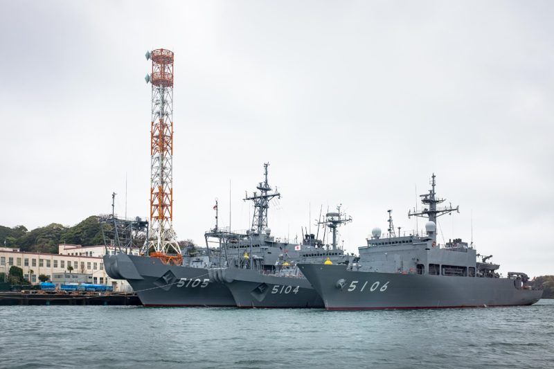 さて潜水艦を通り過ぎてしばらく進むとこのような船が目に入りました。一見するとこれから戦闘に向かう軍艦という感じがしますが大砲が見当たらない...いったいこれらの船は何なのか? 海自の方の説明によれば海水の塩分濃度を計測する専門の船らしいです。日本には3隻しか存在せずこの日はたまたまそのすべてがここ横須賀に集まっていました。ちなみに船体に書かれた数字が3桁のものは戦う事が目的で、4桁のものは調査が目的らしいです。