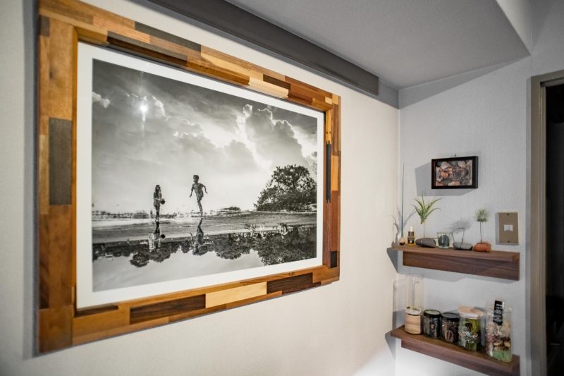 このサイズのマットペーパーってあまり見た事が無く届いた直後は水墨画みたいで若干違和感を覚えましたが、いざフレームに入れてみると表面がガラスで覆われますから均一な反射で自然に見えるようになります。A4テストプリントの段階でグロスペーパーとの比較をしておいたのが功を奏しました。と、簡単に書きましたがこのフレーム実は9.5kgもあるので壁に掛けるだけでも手がプルプルします!