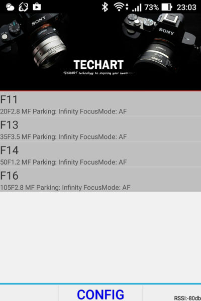 ①TECHARTのサイトよりレンズ焦点距離編集アプリをダウンロードしAndroid端末にインストールしておく。(Android APP for datasettings)