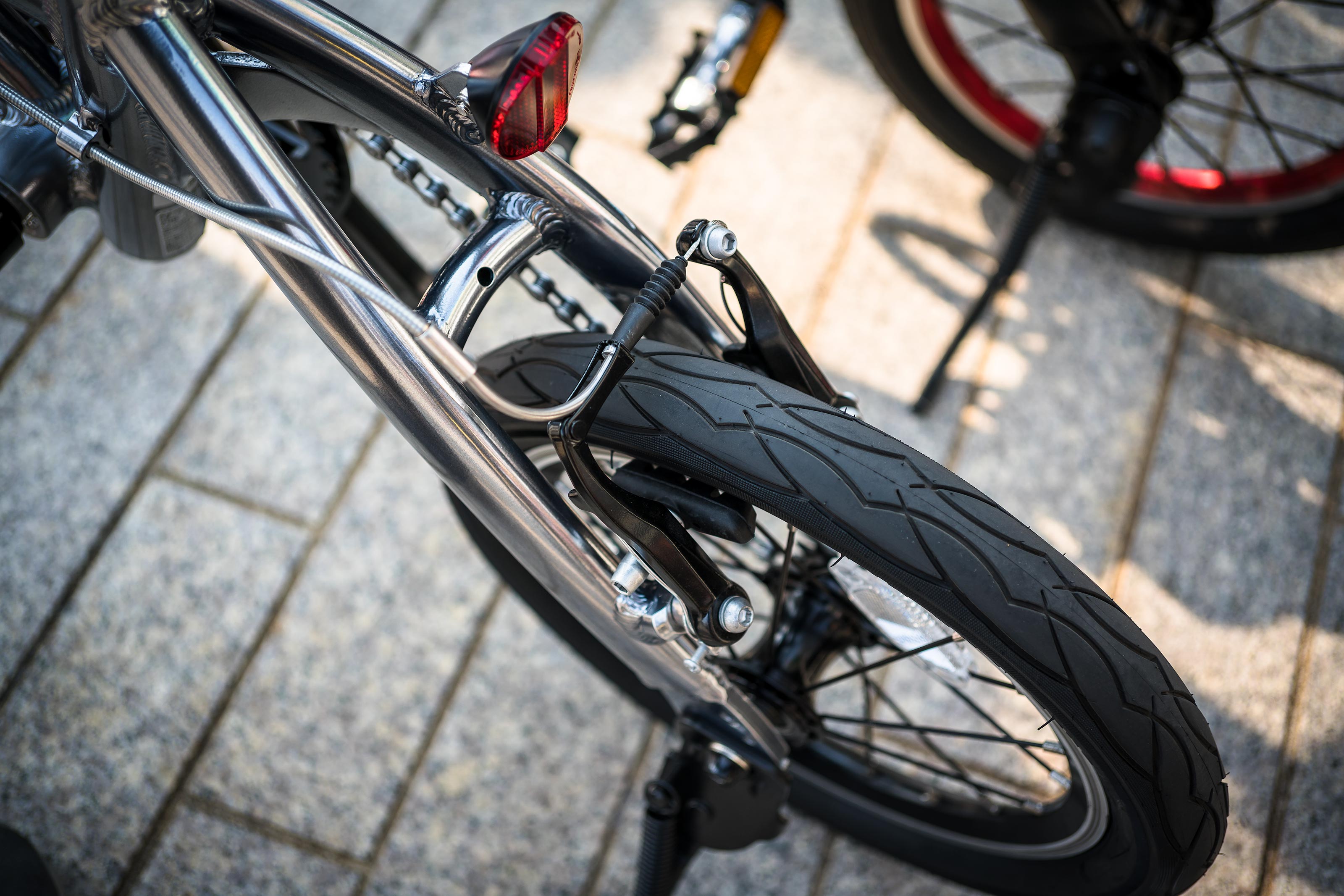 各部のディテールを見ていくと結構本気な感じで作られている事が分かり、前後ともVブレーキだったりするところが憎いですね。チェーンガードも装備されていますからズボンの裾が汚れる事もなさそうですし、MAGNESIUM 8にはディレーラーガードもついていて歩道の段差で擦るような事も避けられそうです。小径車は想像以上にこれらのパーツが低い位置に着いているので結構気を使う部分なんですよね。