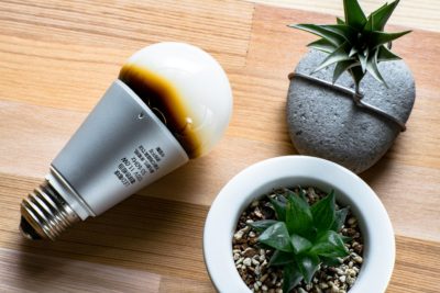 アルミ製のヒートシンク部分と接触しているプラスチックがヒビだらけになり真っ黒。ヒビが大きい部分は電球の中が覗けるくらいに隙間が開いてしまっていて、ちょっと力を入れたらポロッとプラスチック部分が外れて文字通り ”裸電球” になってしまいました。中はLEDの発光素子が円周状に並べられていて、なるほど一番熱くなる部分がそのまま焦げていたわけです。