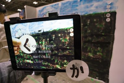 話を聞いてみたところ、どうやら実際に描いた巨大な絵は作品の背景として使うもので、それをタブレットのカメラで撮影することで一つの作品にするのだとか。用いるタブレット用アプリは単なるカメラではなく、”いろはかるた” のように一文字を切り抜いた丸いカードを画面の中にフレームインさせると、それを頭文字にした文章が自動的にオーバーレイされるというもの。