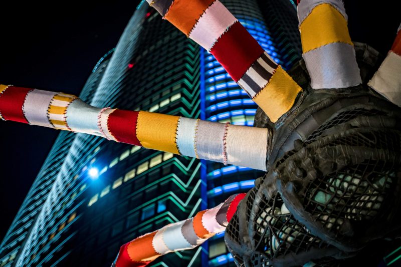 紅白のカラーリングと細長い足の組み合わせは、見方によっては真っ黒だった通常のそれより気持ち悪く感じなくもないですね。現実にこんな感じの蜘蛛やカニっていたような気がするのです。だからなんだかアートと呼ぶより少しリアルな感じがするというか...。足の一本一本を別の配色にするとか電飾で光るとか、非現実的な見た目にすれば純粋にアートとして見れたかも。テキスタイル・アーティストのマグダ・セイエグさんという方の作品らしいですから ”テキスタイル” という点への拘りが重要なんでしょうね。その方を代表するカラーリングだったりとか。