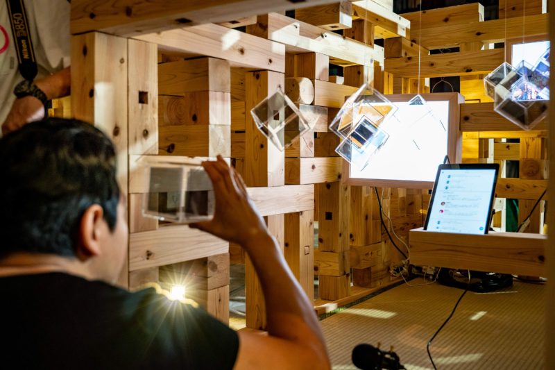 よく分からないアートというのも結構あります。上の写真は昨年も参加されていたので記憶に新しい、偏光フィルターを使ったディスプレイアート。テレビの画面の表面から偏光フィルターを剥がし、手に持てる魔法の眼鏡のようにそのフィルターを使ってのぞき込めば、フィルターを通過した光だけが映像として目に見えるというシンプルにして不思議な現象を木枠のトラス内で見せているから余計に不思議な光景。
