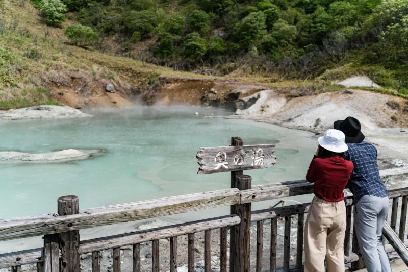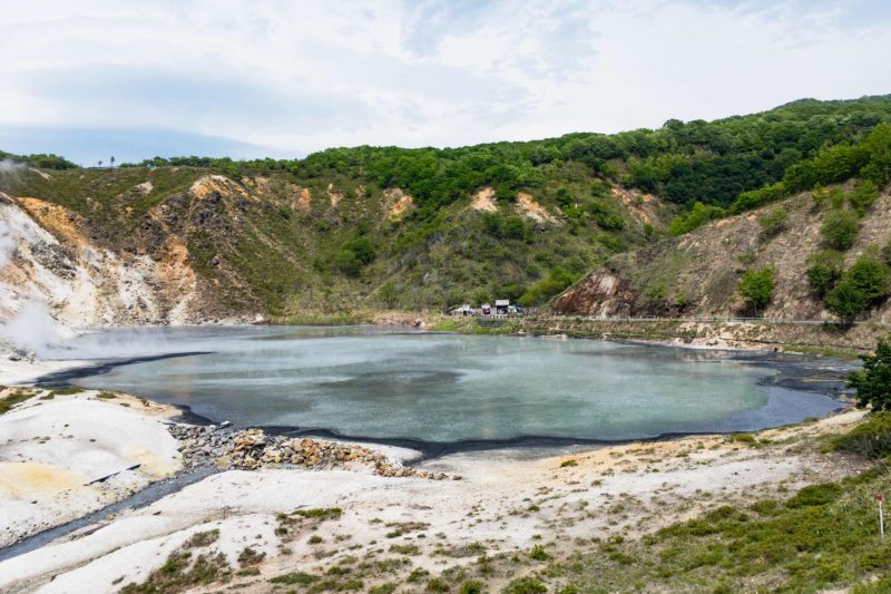 登別の地獄谷から山道を歩く事20分ほどで大湯沼にたどり着きます。ただ、ひと山超える感じですからいくら北海道と言えど正直夏は快適なハイキングというわけにはいきませんね。この時期でさえ結構汗をかきました。