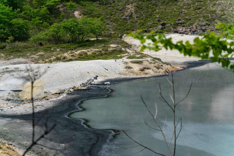 この沼のすぐ脇には ”奥の湯” なる小さめの沼も存在し、こちらはサイズ感だけ言えば巨大な露天風呂に見えなくもない。適温ならきっとおサルさんなども冬には体を温めに来そうな雰囲気でしたが、こちらも75℃~85℃もあるらしく地獄の沼に変わりはありませんね。