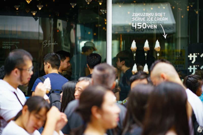 原宿竹下通りならここクロッカンシューザクザク店でしょうか。シュークリームのお店だと思いますがこの時期は圧倒的にザクザクソフトを注文する人が多いようです。多少並ぶものの私も食べてみたところ、チーズケーキみたいなしっかり食感が特徴でどちらかというとこってりした感じですね。下の写真からも分かるとおり立体感が凄い! 外人さんも道路で沢山食べていました。