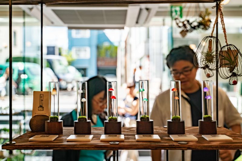 恐らくLEDで点灯させているでしょうからきのこは作り物ですが、ベースとなる苔部分もたぶん作り物。じっくり見ても本物のような質感で良く出来ていました。昨日のブログでペイントについて書いたように、ボタニカルアレンジはラフな仕上げがかっこいい場合とこの作品のように構造はシンプルでも繊細な作りが美しく感じる場合とあるので、実際購入するなら組み合わせや置き場所のチョイスを工夫したいところですね。