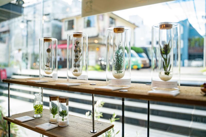 ガラス容器に少量の水を入れ植物を封じ込めたようなこちらの作品。よく見れば中身は生花ではなくドライだからしておのずと見えてくるのは ”水” と思いこんだそれはレジンやシリコン系の樹脂。