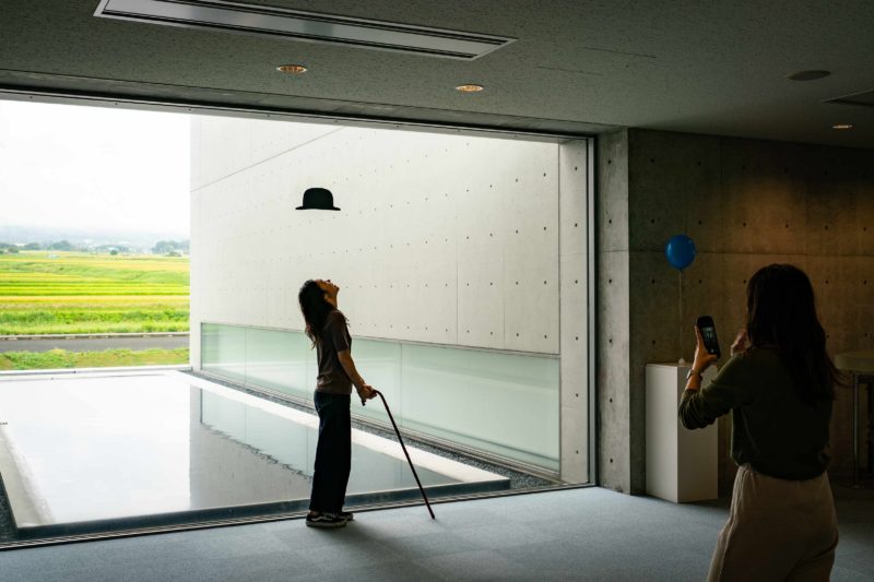 はい。このようにガラスに帽子のシルエットがプリントされているのです。こんな演出が似合うのはチャップリンと植田正治さんくらいのものですね。そしてそこには風船やステッキが小道具として準備されていますから皆思い思いの創作写真が撮れるというわけです。「インスタ映え」なんて言葉が使われるようになってからこの場所は一層人気になったんじゃないかと思います。
