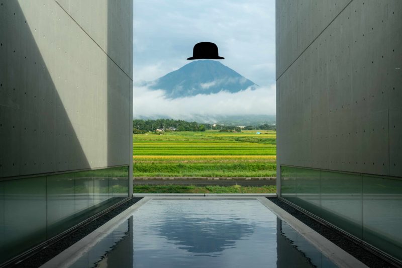 昨日の日記にも書きましたが、この近未来的なコンクリートの巨大な建物がなぜ田園風景の真ん中に建てられたのか、理由はこの ”大山” を正面に見られることを条件にしたと言われています。だから「向こうのほうに大山が見えますよ~」ではなく大山に向かって建築の角度まで緻密に計算された立地! このポイントであれば建物は完全なるシンメトリーで、水面への反射さえ計算され帽子のオブジェ付き!