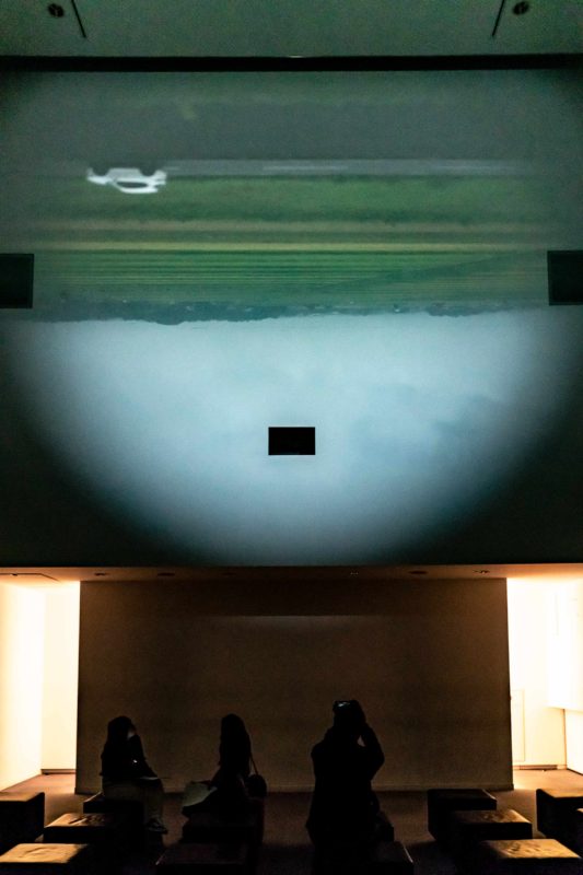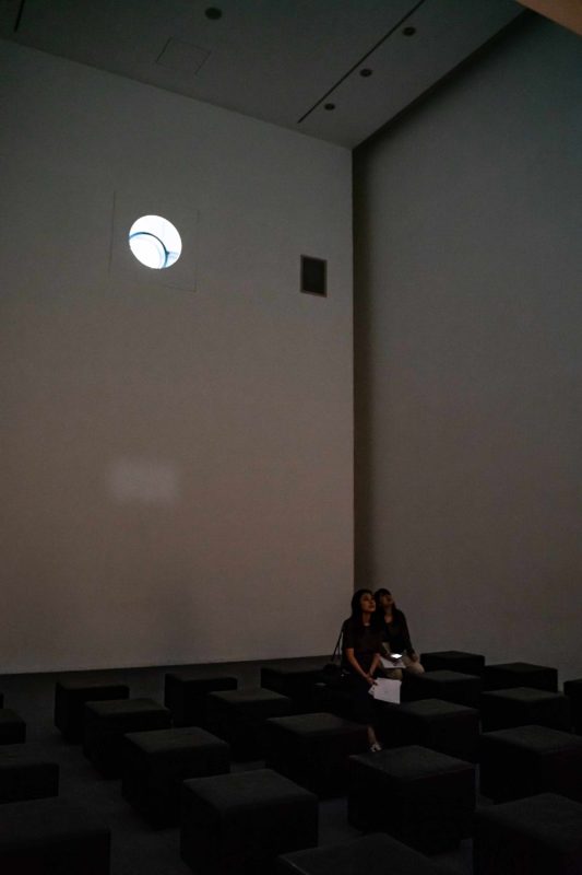 上の写真は上映終了直後を写したもの。ほとんどのお客さんは退室してしまいましたが残った2名のお客さんは正面のスクリーンには目もくれず室内の後ろの壁を眺めています。そして壁の遥か上の方には何やら丸い穴が開いています。これは実は世界一大きなレンズで、重さは600kg以上もあるそうです。さていったいそんなレンズがなぜ必要なのか?
