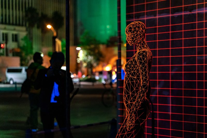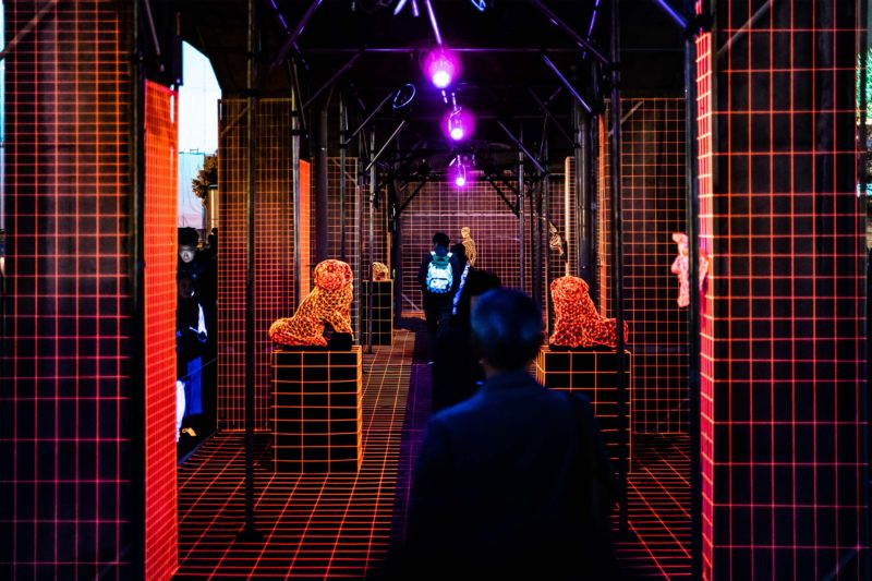 まあ普通に考えるとレーザー光線だよね? と思うわけですが実は違ったんですよね。これすべてブラックライトの反射で光っているようです。沢山の格子模様は白い糸が規則正しく張られておりそこにブラックライトを当てることで光ったように見えている...。ブラックライトの反射でよく見るのは青白く光るものですが、こちらの糸はおそらく赤く反射するよう特殊な塗料が塗られているのでしょうね。一枚目の写真で前方を歩く人のリュックが白く光っているところを見てもブラックライト自体は一般的なものである事がわかります。