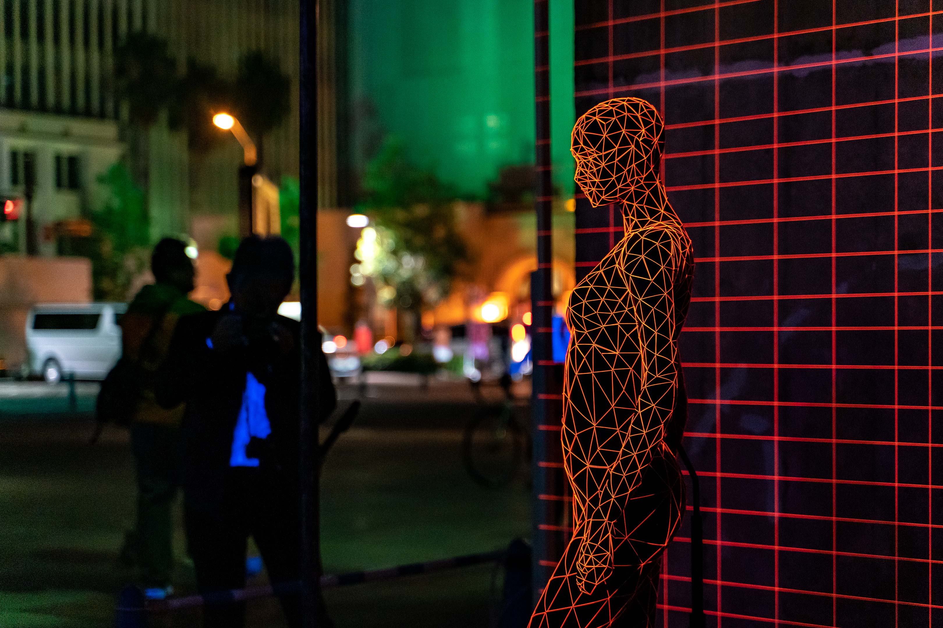 まるでCGの世界に飛び込んだようなグラフィカルな空間も光による演出。この幾何学的な真っ赤なラインはいったいどうやって光らせているのか? 誰もが近づいて確認していました。