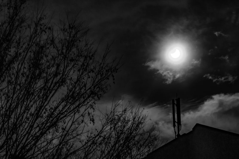 近所の公園まで出かけるつもりが道中でピークの時間を迎えてしまったため、駅前ロータリーにて撮りました。きっと沢山の人が一斉に空を見上げていることだろうと予想していましたが、周囲にそんな人は誰もおらず皆黙々と歩いているのみ。3重にフィルターを重ねた “あきらかに怪しい撮影スタイル” の私だけがちょっとした変質者。でも堂々と交番の前での撮影ですから誰にも通報はされず...。