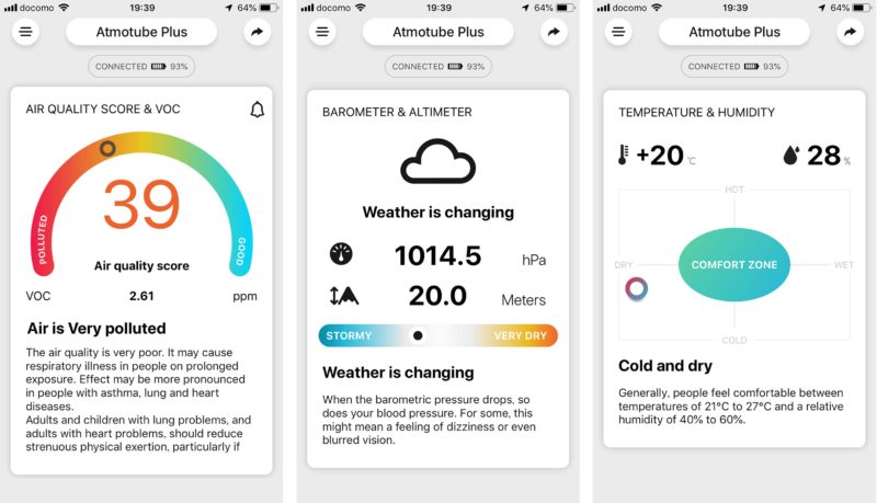 機能としては空気の汚れ具合を表示するVOC、気圧と高度表示、温度湿度表示の3点を2秒間隔で計測しており、本体に多少のメモリーを持っているのか専用スマホアプリと同期した際に過去ログがシンクロする仕組み。勿論アプリ起動中は2秒おきに実データがダイナミックに更新されるため、軽く息を吹きかけたりすれば即座に変化が現れるのが面白いところ。