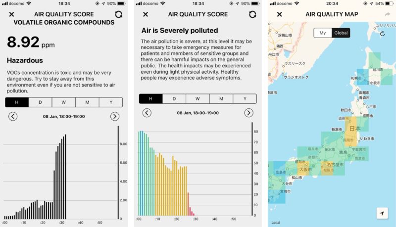 また、アプリには地図表示もあり、同様のデバイス所有者が共有しているスコアがマップ上にカラー分布でオーバーレイされる仕組み。でもこのスコア自体が地域というよりは置かれた環境に影響されるものですから地図表示はさほど意味を持たないかもしれませんね。それでも空気汚染量の見える化はなかなか面白いです。