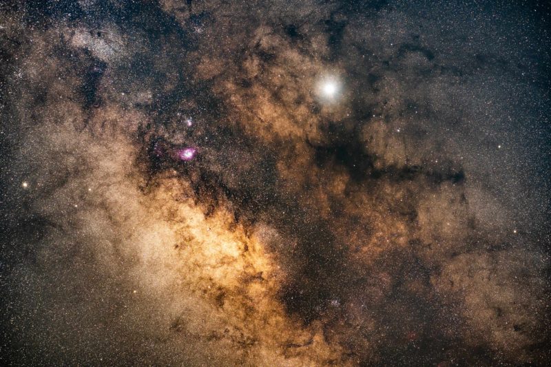 天の川の中心付近、さそり座の左あたりの一番ゴージャスな部分を狙っています。真ん中あたりでひときわ明るく輝いているのは木星。こういう派手な写真は冬の銀河には見られない夏ならではの光景ですね。時間の関係で同ポジ撮影は4枚しか出来ておらずスタックによるISO感度は1600の1/4で400程度となりまだまだ荒れた感じが残りますから、こういうのを撮る時は16枚くらい撮ってスタックし換算ISO100程度まで下げられればもう少しクリーミーな感じに仕上がりそうです。制作プロセスはかなりディープではありますがアウトプットは誰の目にもわかり易い印象的なものになりますね。