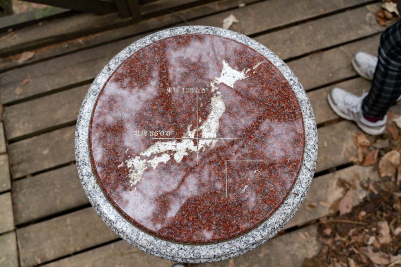 東経137度59分36秒、北緯36度00分47秒と記されています。この標は1枚目の写真の展望台から100メートルほどの距離にあり、おそらく標のある場所が中心地で、展望台は観光用として見晴らしの良い場所に建てたのだろうと思います。