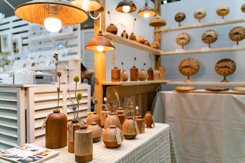 と、そんな一輪挿しばかりに目がいっておりましたが、頭上を見ればランプシェードなども全て木で出来ているじゃないですか!多分それも全部商品。バックに並んでいる時計はもうお馴染みですね。こうして見ると主に旋盤による加工が得意なんですかね? どれもすごく精度良く仕上げられていました。独特の優しい丸みの出し方が特徴ですね。