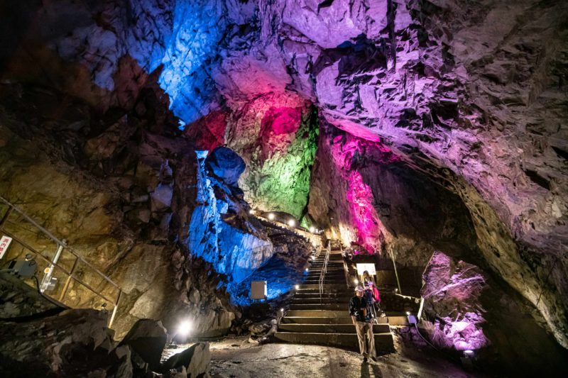 日原鍾乳洞最大の見せ場がここ。色とりどりの照明で演出された巨大な空間は視界に入った瞬間に皆が「おぉ~」と声を上げるほど。これが人の手で作られたものではなく自然の造形だという事に驚きますね。なぜこの山奥にこんな空間が出来たのだろう...と。まあそれを見つけた人も凄いですが。