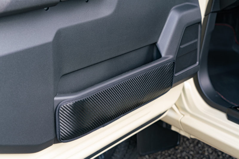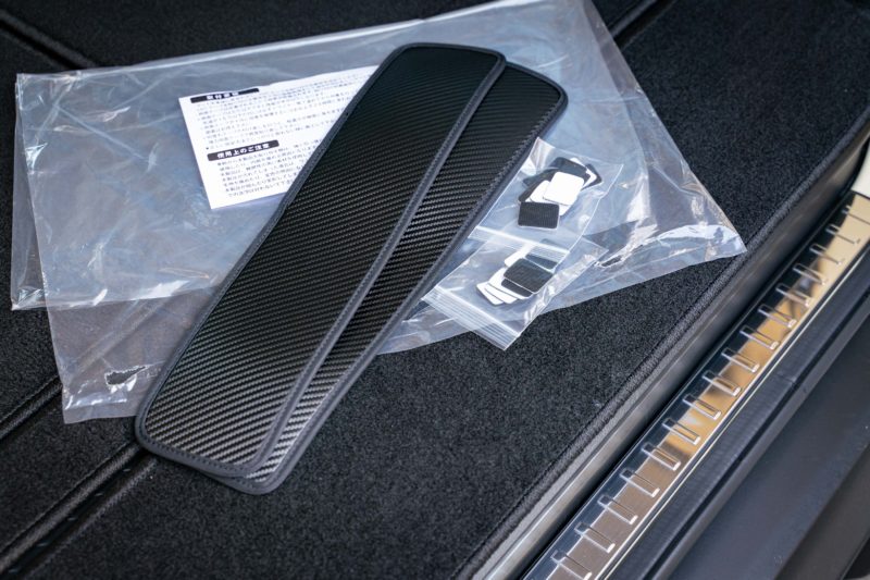 目的としては乗降時にドアを蹴飛ばしてしまっても傷がつきにくく汚れも落ちやすいという点につきますが、市販品のままではドアスピーカー部分までを丸ごとカバーしてしまい音に影響が出そうだったため、私はそこを避ける形状にしてもらっています。表面は3Dカーボン調レザー、裏面は厚さ4mmの高密度ウレタンとされています。カーボン柄ってあまり好みではないのですが、柔らかパッドなのでまあよしとしました。