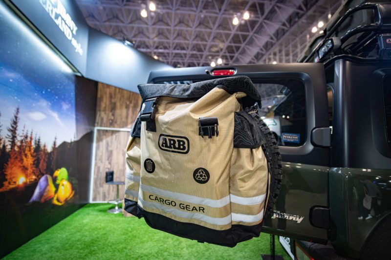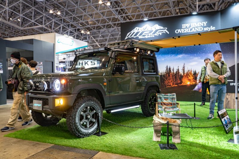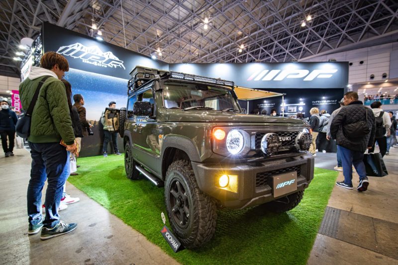 今年のジムニーデモカーは各社こんなふうにリアのスペアタイヤに何かしら背負わせるのが流行っていました。ジムニーの場合スペアタイヤに関しては車の全長に含まれないですからこうしたパーツも同様と考えれば合法的な搭載方法なのでしょうね。