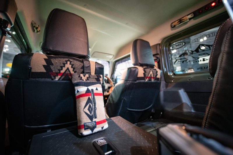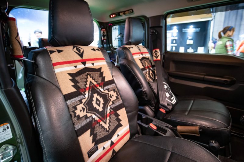 このシートカバー実にカッコいいですよね。PENDLETON柄とジムニーってよくマッチすると思います。単なるブラックレザーでは暗くなりすぎる車内がこの柄のおかげで明るくなり、かつお洒落に仕上がりますからとても魅力的。