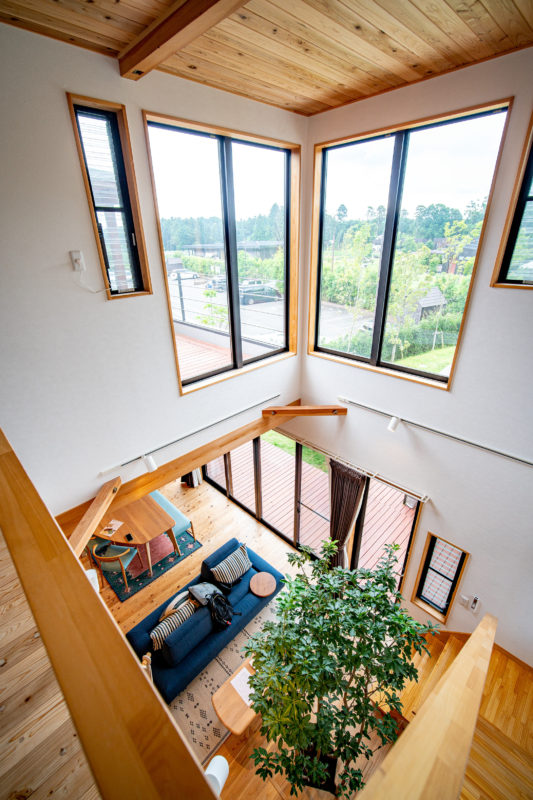 2階から階段の方向を振り返れば1階からの吹き抜けが見えます。大きな窓で開放的に設計されており非常に明るい空間。植えられた木が成長して背丈が伸びてもこれなら巨大なクリスマスツリーみたいに楽しめますね。