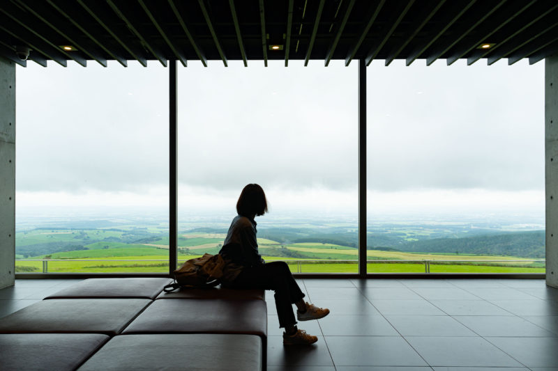 地形と一体化した展望テラスは駐車場側から見るとなんだか背の低い横長の博物館みたいに見えますが、中に入ってみると床から天井まで全てガラス張りで出来ており雨の日でもこの高原を一望できるよう最高のロケーションを実現しています。