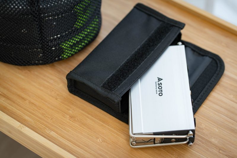 G-Stoveはブック型と呼ばれる珍しい形状が最大の特徴。折りたたんだ状態であれば厚みがわずか25mmとかなり薄く長財布程度のコンパクトさ。何より真四角なのでキャンプ道具一式をまとめて箱に収納するような場合にも収まりが良いです。見た目にも美しいですね。