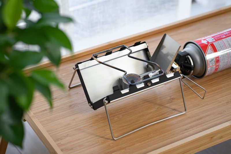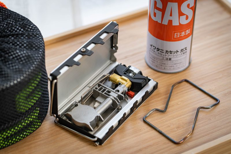 バーナー本体を取り出して本のように開いたアルミボディにセットするだけで組み立て完了。あとはCB缶のガスボンベを取り付ければすぐに調理がスタートできます。