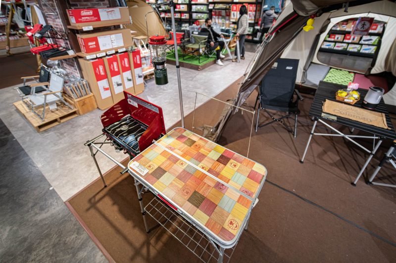 テントじゃありませんよ、ここで注目したのは手前にあるテーブルです。その名も ”オールインワンキッチンテーブル”。