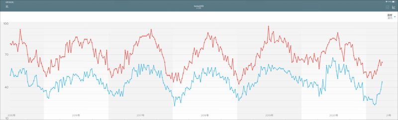 さて今日掲載したグラフは何を表しているか分かるでしょうか? 直近5年間の湿度の変化です。と言っても我が家の屋内計測の結果ですから屋外観測による地球温暖化の変化を地球規模で語れるものではありませんが、2013年に購入して以来7年間自動計測を続けてくれているNetatmo Urban Weather Stationのログです。勿論温度も計測されていますが掲載したのは湿度の変化。最高値を赤線で最低値を青線で表示しています。