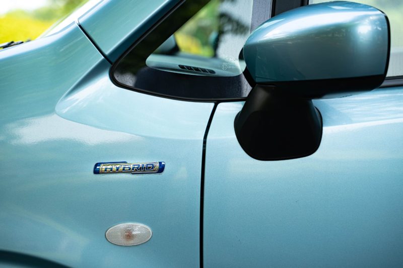 ありがたいことにこの車ハイブリッドのエンブレムがついており、少なくともジムニーよりは燃費は良いだろうとのこと。ハイブリッドと言ってもトヨタプリウスみたいなのを想像すると大違いで、スズキのハイブリッドはマイルドハイブリッドと呼ばれる ”エンジンをちょっとだけアシストしますよ” 程度のものなのでEVのみの走行とかはほぼ出来ませんね。感覚的には電動アシスト自転車みたいな感じでしょうか。