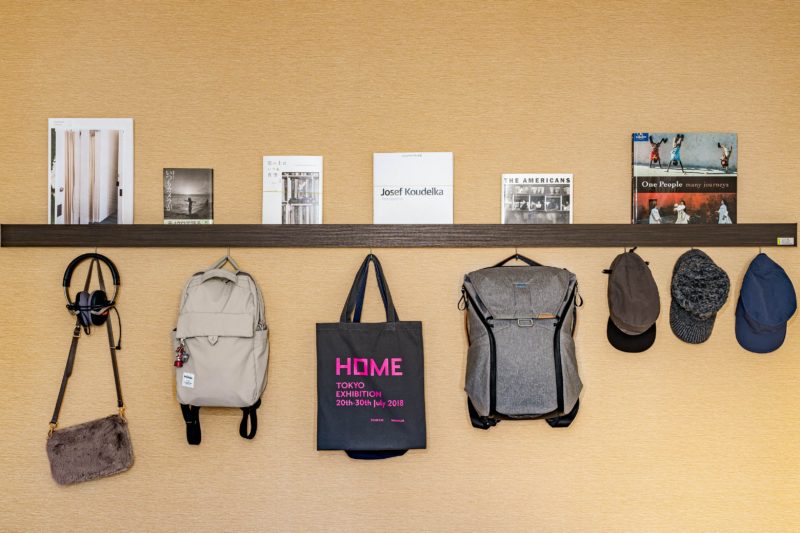 ウォールシェルのようなブックスタンドの下はいくつかのフックが付いているのでバックパックや帽子を掛けておくことが出来てなかなか機能的。こういうの床に置いているとそれだけでごちゃごちゃしてしまいますし場所を取りますからね、こんなふうにディスプレイ的収納で解決。