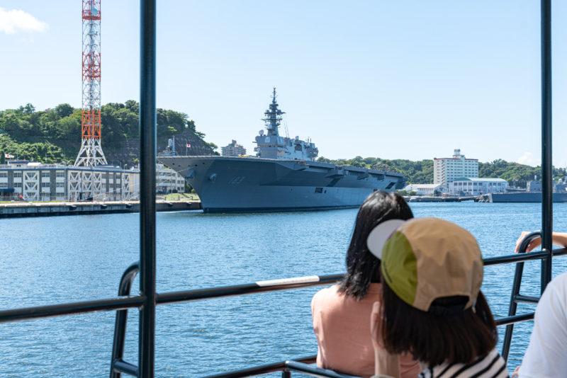 クルーズ船に乗っていると右に左にひっきりなしに珍しい船が出てきます。航空ショーでジェット戦闘機を見るのも楽しいですが、この横須賀基地ならではのドキドキ感というのもまた独特のものです。なんたって飛行機より船は大きくて迫力がありますし、普段見ることのない姿ですから非日常感が凄いんですよね。