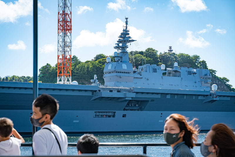 日本には ”空母” は無い! というのが私の認識。前回ここを訪れた時は対岸にアメリカを代表する空母 ”ロナルドレーガン” が停泊していたのを覚えていますが、今回はどういうわけか日本の船が並ぶ一角に空母らしきものがありました。あれ? なぜ日本の船の中に空母が?