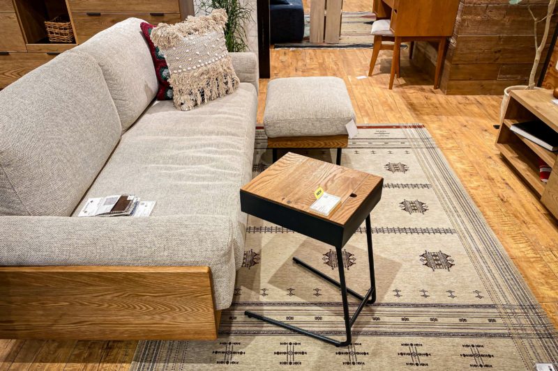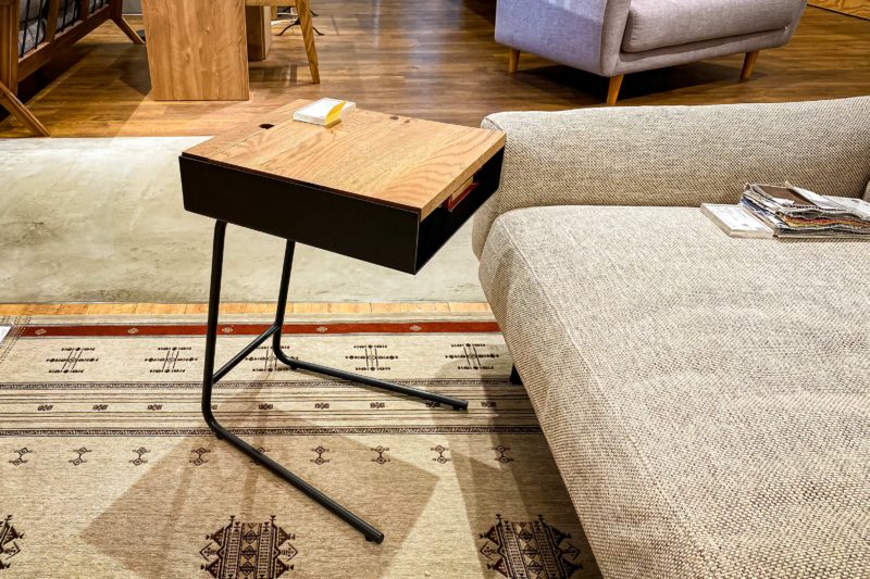こちらは購入には至らなかったもののデザインと機能性が気に入ってしまったサイドテーブル。ソファー脇でも良しベッド脇でも良し、ちょっとした飲み物を置けるのは勿論のこと、ちょうどA4サイズくらいのトレイ形状となっているため雑誌などを入れておくことも出来、卓上にケーブルを出しておく穴も開けられているためスマートフォンを充電しながら使うことも可能。これもなかなか良いじゃないですか!