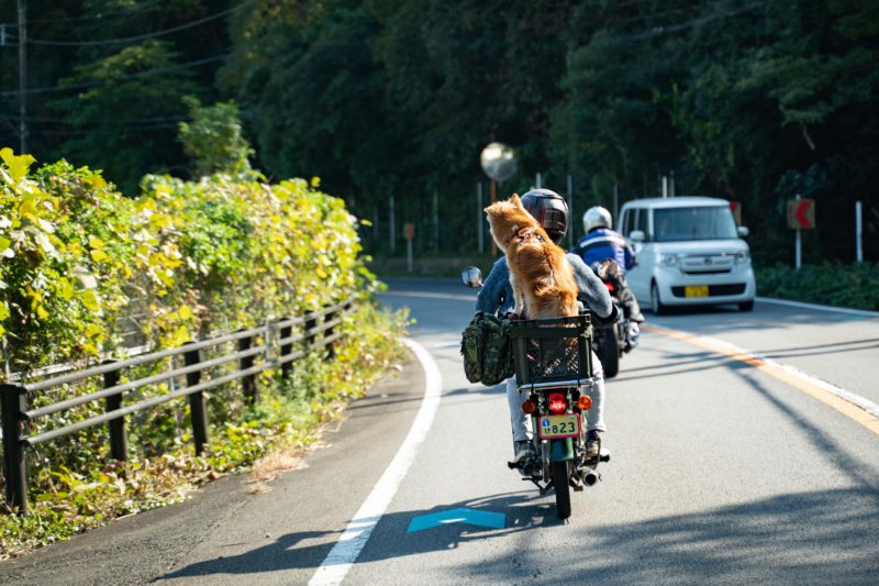 それもケージなどに入れているわけではなくプラスチックのケースを荷台にくくりつけているだけでワンちゃん自体は固定されていないですからね。そこそこの速度で峠のカーブを右に左に曲がればワンちゃんもちゃんと体重移動をして状態を寝かせるので人間の二人乗りと変わらない感じ。とても微笑ましい光景でしたね。