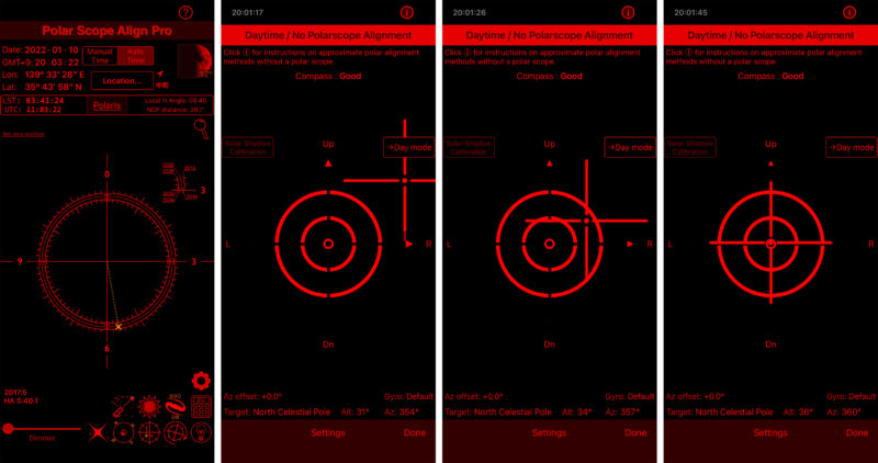 つまり北極星に対するアライメントを読み取る事ができますから、スマートフォンを赤道儀と平衡に固定さえすればスマホの画面に表示される照準を見ながら極軸合わせが出来るというわけです。上のスクリーンショットのうち左から2番目がざっくりと北極星の方向にスマホが向いている状態。+位置が表すポジションが北極星の位置ですね。◎の中心が赤道儀の中心。ここから+の位置が◎の中心に重なるよう微動雲台を調整し徐々に追い込んでいった図が右の2枚。最終的には+と◎が重なっていますからこれにてスマートホンの向く先に北極星が存在することになります。つまり荒動による極軸合わせが完了というわけ。