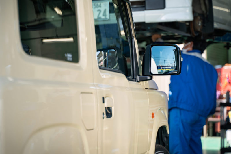 愛車ジムニーの一部点検修理のためディーラー訪問。今回は運転席側ドアミラー修理がメイン作業。