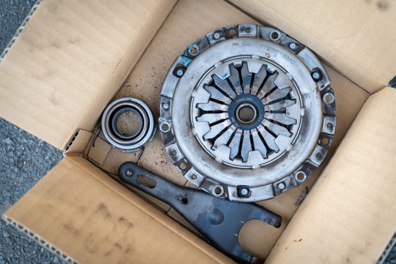 せっかくミッションまで下ろしてクラッチのオーバーホールをするのですから、関連するその他パーツもこの際一気に新品交換します。クラッチカバー、クラッチディスク、レリーズフォーク、レリーズベアリング、パイロットベアリング。つまるところフライホイールを除くほぼ全てのクラッチ関連パーツを新品にして頂きました。
