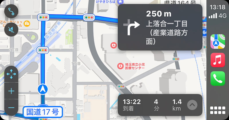 こちらはiPhoneをカーオーディオに接続しCarPlayによるナビ画面を表示したものです。地図アプリはアップル純正Map。普段iPhoneの画面で見ている地図画面はCarPlay上ではこのように完全なるカーナビ画面に特化されているため、スマートフォンを車のダッシュボード周りに固定して使うより遥かに使い易く感じます。