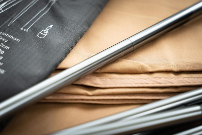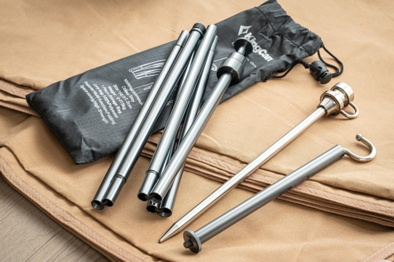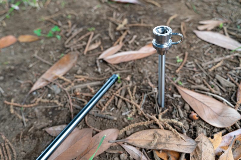 ポールに切られたネジと直結出来る専用ペグを地面に打ちつけ、そのナット部分にポールをくるくると回し入れるだけ。こちらのペグはずっしり重く強度が高いだけでなく錆びないようステンレスの削り出しで作られています。