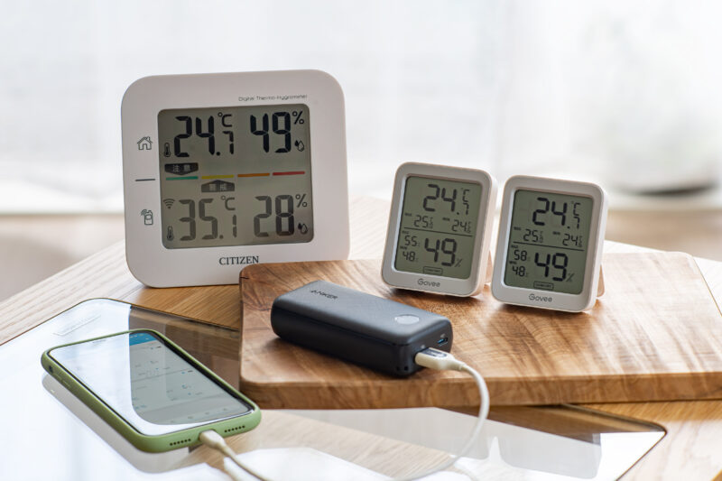 さて、温湿度マニアの私ですからその他の部屋にも温湿度計が設置してあるわけですが、今年の春先に寝室に導入したGovee湿度計温度計H5075がなかなか使い勝手が良いので、今回は趣味部屋用に同モデルを追加購入しました(写真右の小型温度計2つ)。